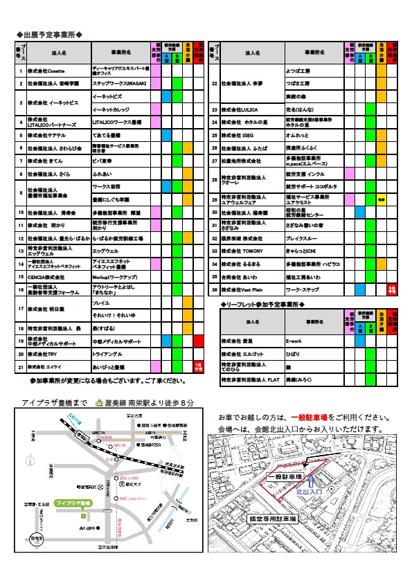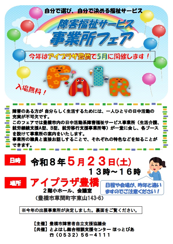 🌟令和8年度の障害福祉サービス事業所フェアは令和8年5月23日(土)に開催されます。 令和7年度の障害福祉サービス事業所フェアは令和7年8月9日(土)に、ほいっぷ講堂で開催されました。令和8年度は、場所をアイプラザ豊橋に変え、開催時期も早めて開催をしていきます。詳細は4月にご案内します。お間違えの無いようにお願いします。簡易チラシはこちら。