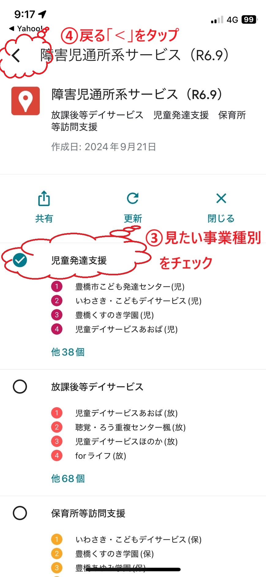 ⑤マップ上に事業所のポイントが表示されますので、地図上の数字をタップすると事業所情報が表示されます